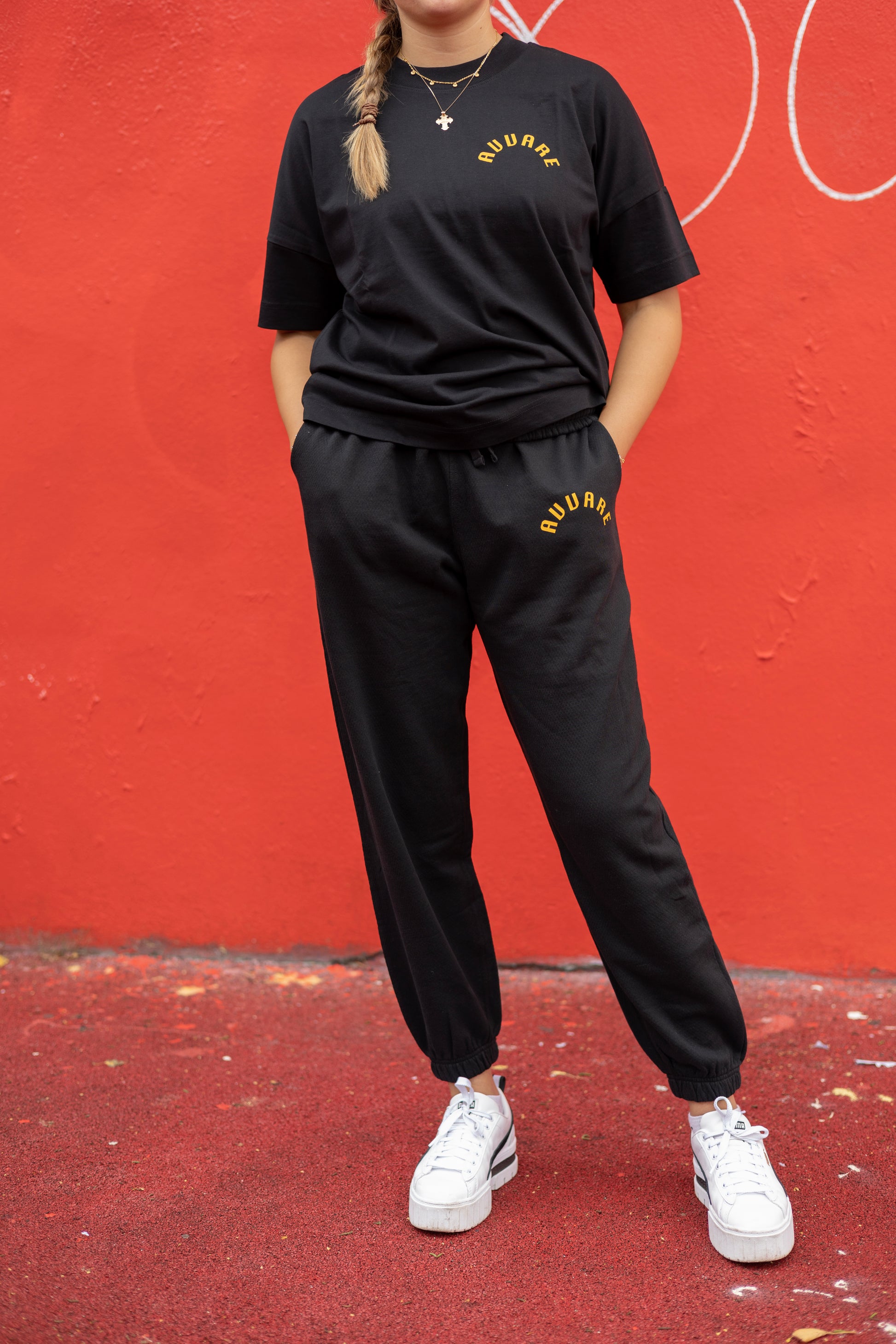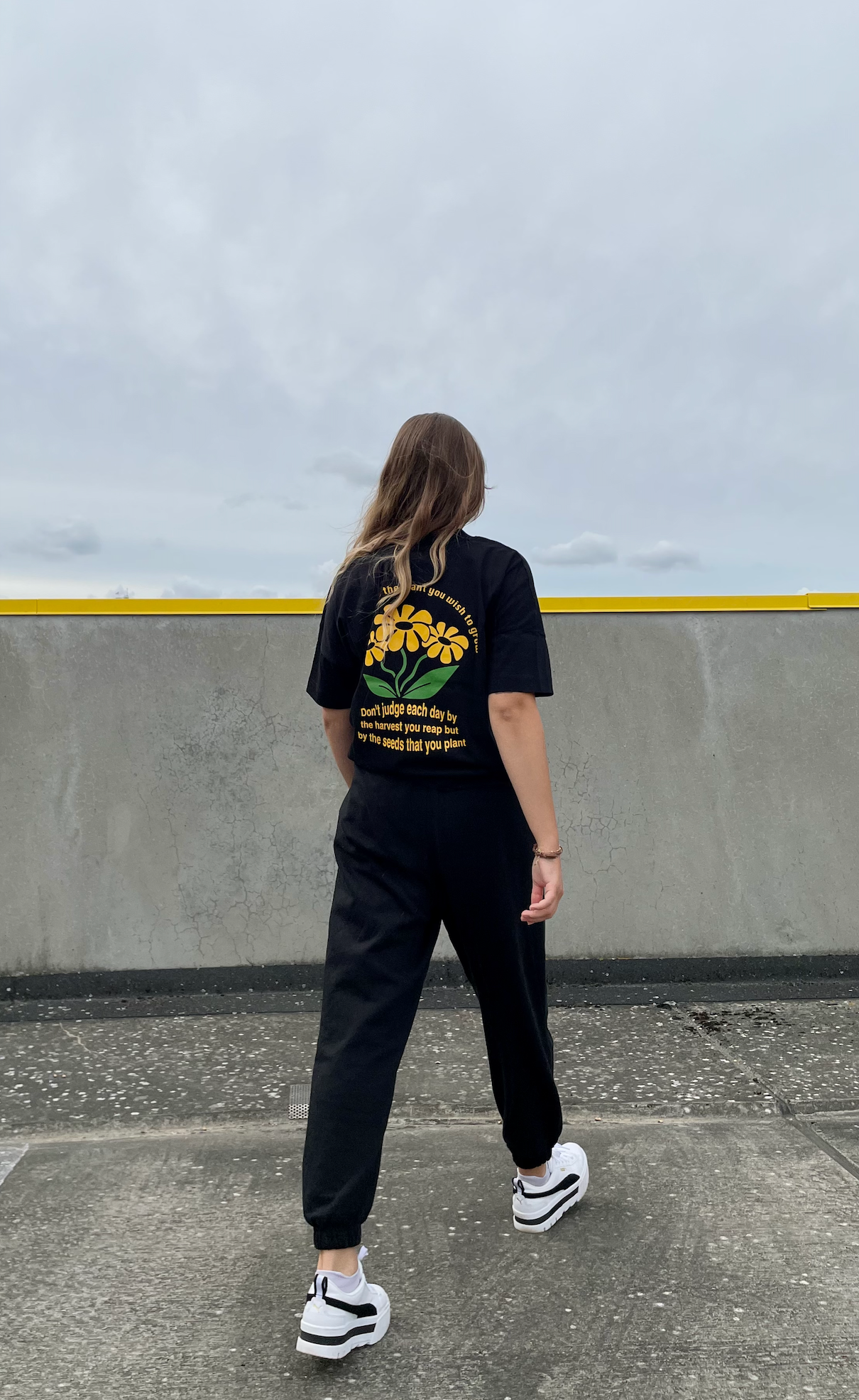 Black Sunflower sæt, som alle andre produkter i Collection no. 3, er lavet af stof af økologisk oprindelse, genbrugt stof og er vegansk godkendt. Det super bløde og behagelige stof er både godt for dig og planeten. T-shirten er i en oversized, boxy fit med stort print på ryggen. Bukserne er oversized og med print på lommen.