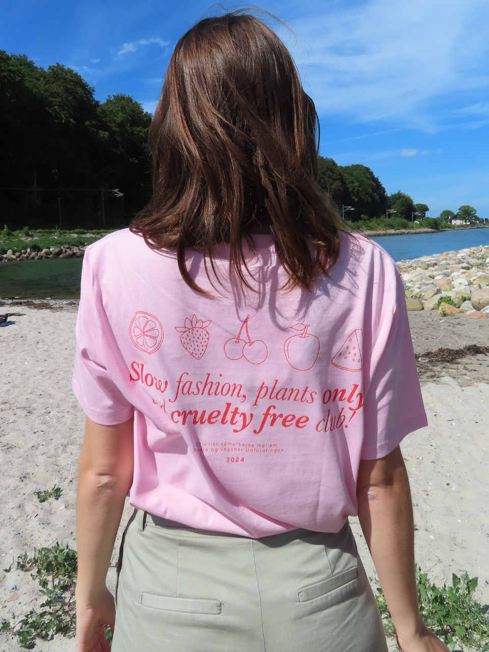 T-shirten er lavet af stof af økologisk oprindelse og er vegansk godkendt. Det super bløde og behagelige stof er både godt for dig og planeten. T-shirten er i normalt fit med stort print på ryggen, som selvfølgelig også er vegansk. T-shirten kommer i en hvid og lyserød model.