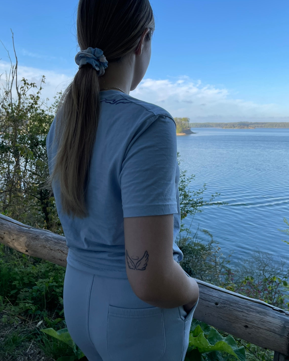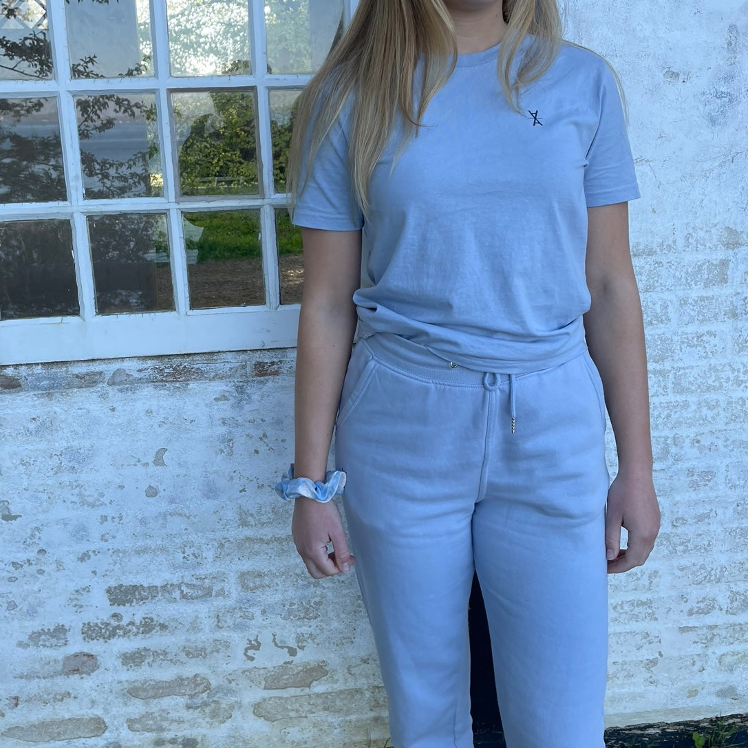Wave-sættet som alle andre produkter i Collection no. 1 er lavet af stof af økologisk oprindelse, genbrugt stof og er vegansk godkendt. Det super bløde og behagelige stof er både godt for dig og planeten. Joggingbukserne er i normal pasform med justerbar talje, en baglomme og to forlommer. T-shirten er i regular fit med rund hals. Wave-sættet er en afslappende lyseblå farve, som passer perfekt til alle tider af året. Sidst men ikke mindst er t-shirten broderet på højre skulder med et håndlavet bølge-silhuet broderi.