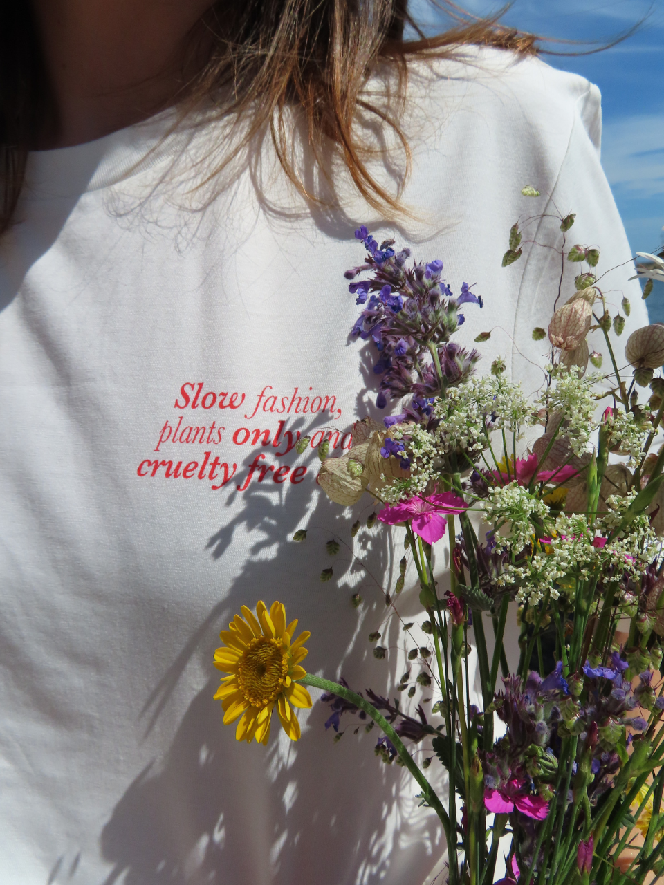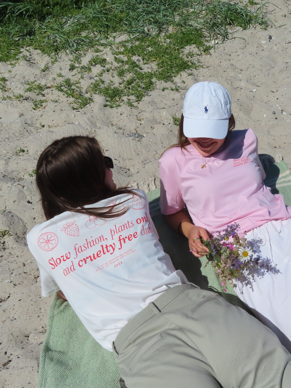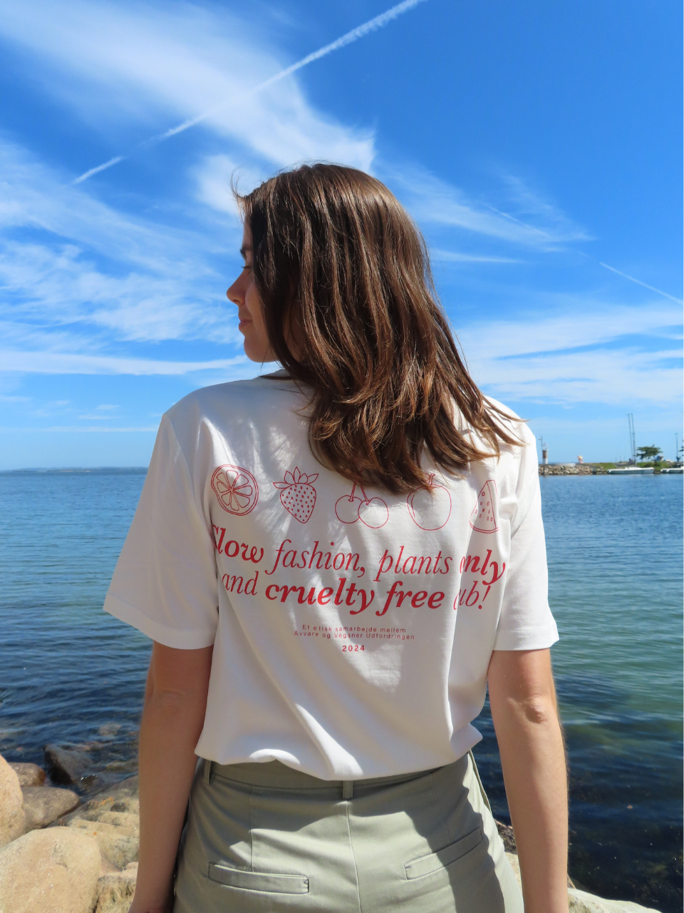 T-shirten er lavet af stof af økologisk oprindelse og er vegansk godkendt. Det super bløde og behagelige stof er både godt for dig og planeten. T-shirten er i normalt fit med stort print på ryggen, som selvfølgelig også er vegansk. T-shirten kommer i en hvid og lyserød model.